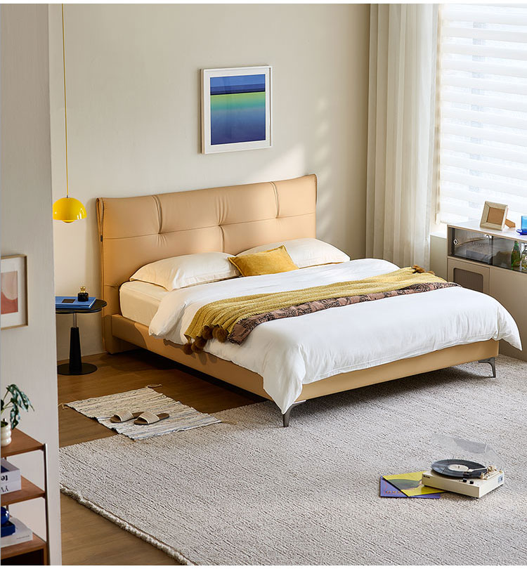 Modernidad atemporal: con sus líneas depuradas y su tapicería texturizada, esta cama se erige como una impresionante pieza central.