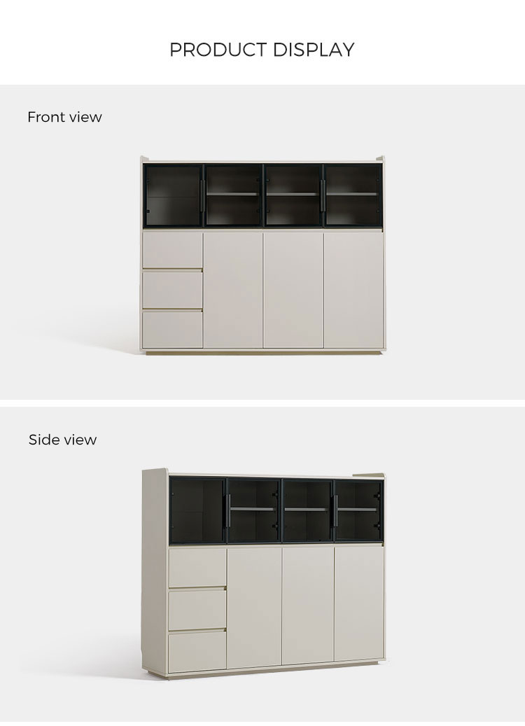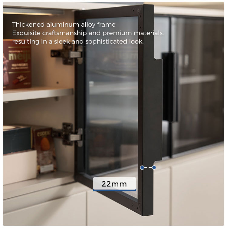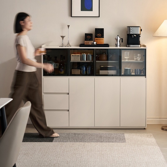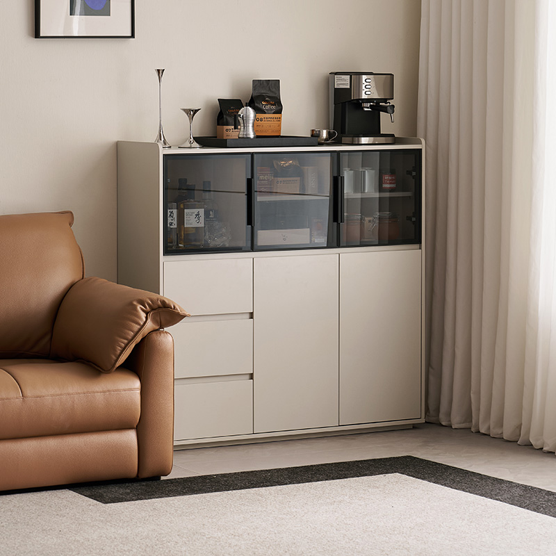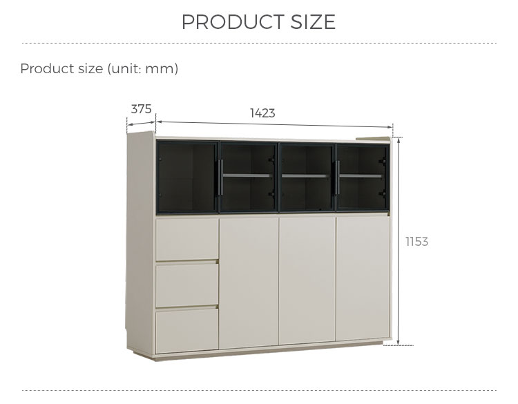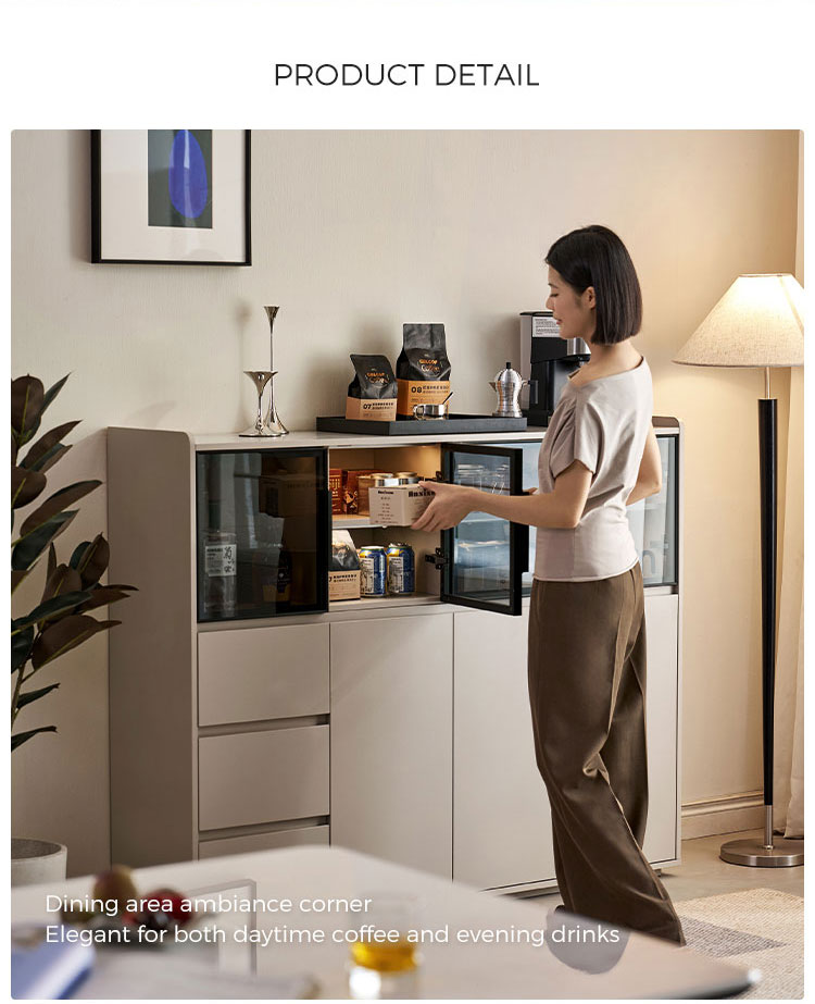 Su característica más destacada son sus grandes puertas de cristal, que permiten exhibir con estilo vajillas, cristalerías y artículos decorativos preciados, manteniéndolos a salvo del polvo. Esto crea una sensación de luminosidad y amplitud. Complementando las puertas de cristal, se encuentran múltiples cajones espaciosos que ofrecen un almacenamiento oculto amplio y bien organizado. Estos cajones son ideales para guardar con orden cubiertos, mantelería, utensilios o cualquier artículo esencial de la sala, asegurando que todo esté en su lugar.