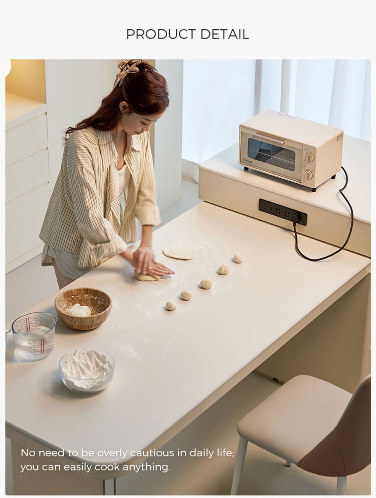 Esta sofisticada isla de cocina blanca es la pieza central de la vida moderna. Fabricada con piedra sinterizada blanca resistente, ofrece un espacio de trabajo impecable e higiénico que se integra a la perfección con la iluminación ambiental. La isla cuenta con una distintiva base de madera. , añadiendo calidez y textura orgánica para crear un ambiente acogedor.