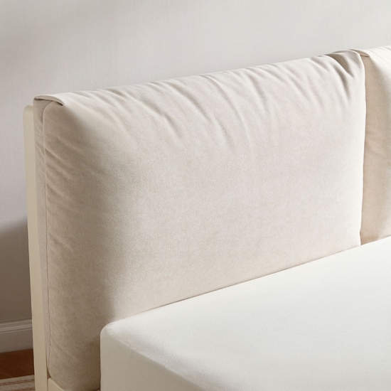 La suave tapicería de cuero en un delicado tono gasa ofrece una lujosa comodidad al tacto, adaptándose delicadamente al tacto. El cabecero, con un acolchado profundo y detalles de costuras verticales, proporciona un soporte ergonómico para leer o relajarse.