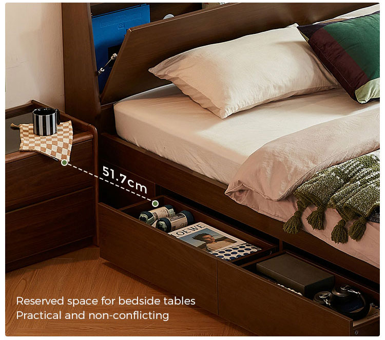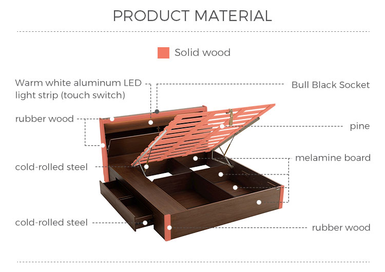 Su característica distintiva es su base de almacenamiento integrada de gran altura con un suave mecanismo hidráulico de elevación. Este innovador sistema transforma toda la plataforma del colchón en un amplio espacio de almacenamiento de fácil acceso. Es ideal para guardar artículos voluminosos, de temporada o de uso poco frecuente, como ropa de cama adicional, edredones de invierno, almohadas, equipaje, ropa de temporada o cajas de recuerdos, liberando así un valioso espacio en el suelo y despejando el dormitorio.