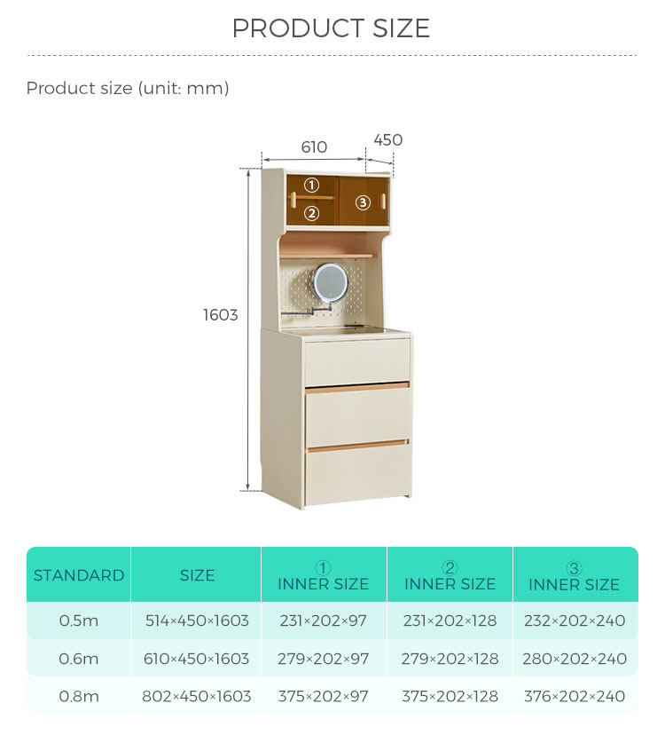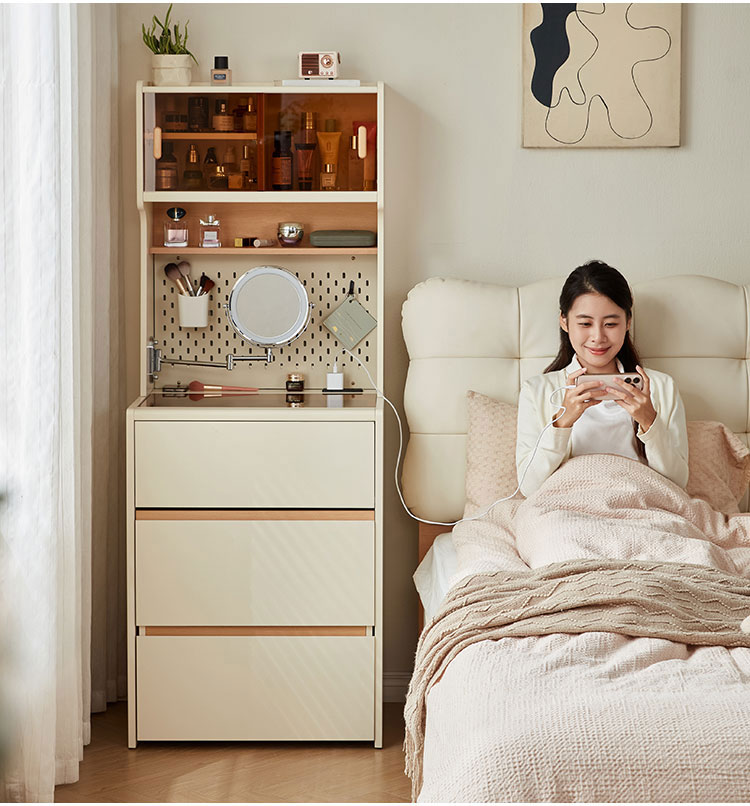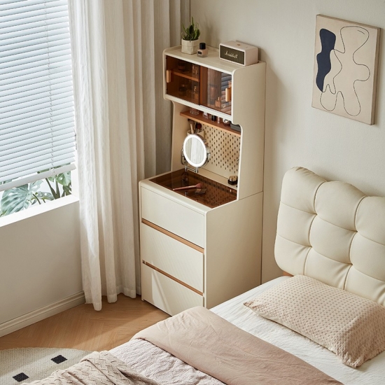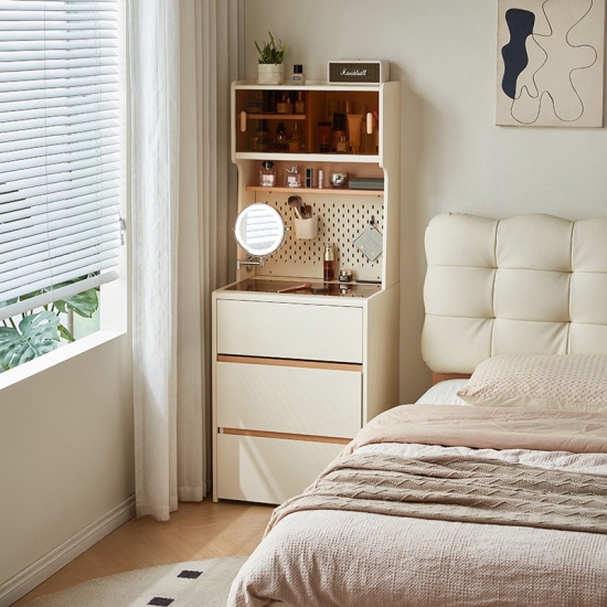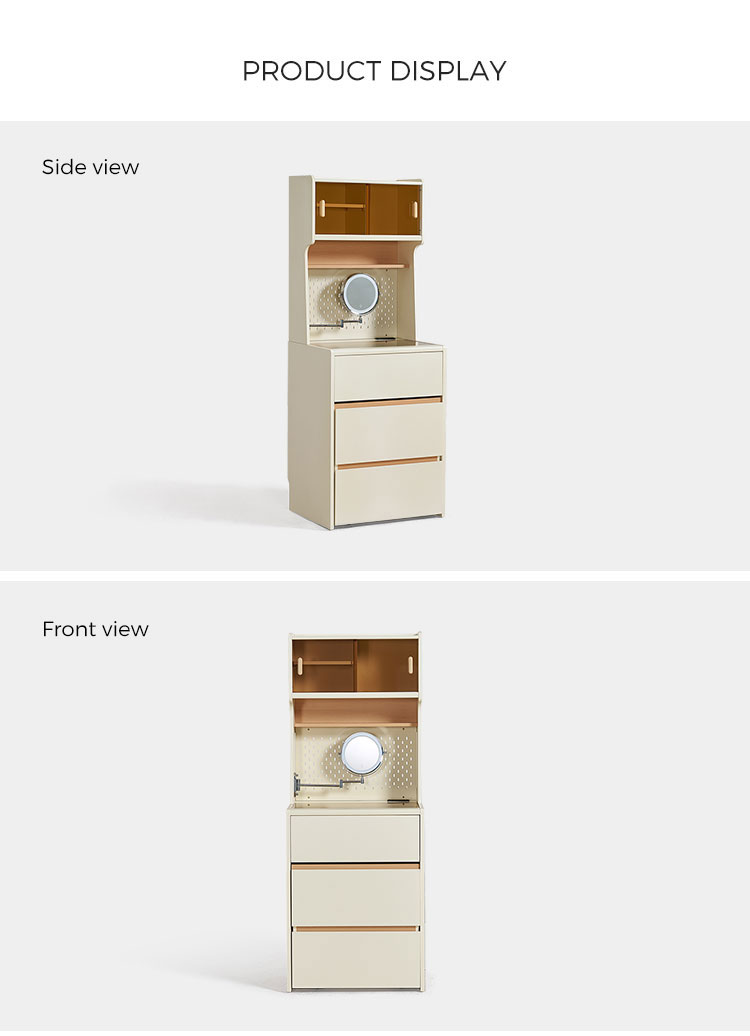 Este tocador compacto de 0,6 metros combina a la perfección un elegante tocador con un armario alto en una pieza moderna y unificada. Con un acabado blanco impecable, su diseño minimalista incluye un panel trasero integrado de tablero perforado (tablero de clavijas). Esta ingeniosa adición facilita una organización superior: usa ganchos, estantes y accesorios para mantener los utensilios de maquillaje, productos para el cuidado de la piel y otros accesorios ordenados y al alcance de la mano.