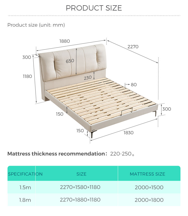 Equipado con un robusto sistema de láminas diseñado para brindar un soporte óptimo a su colchón, promoviendo una alineación adecuada de la columna y una comodidad duradera. La carpintería de precisión en la construcción de madera garantiza una rigidez sin chirridos. La tapicería luce costuras meticulosas y una integración perfecta de los materiales.