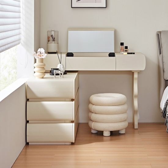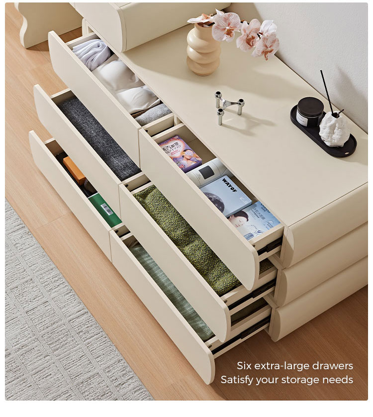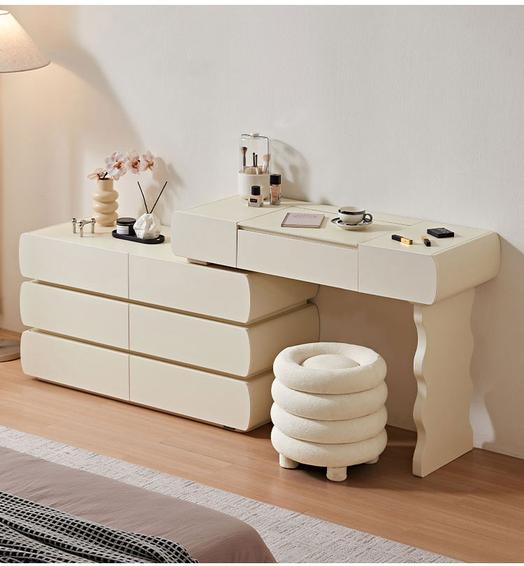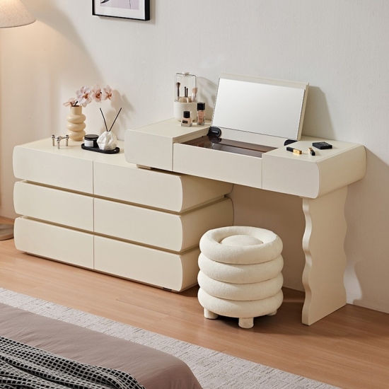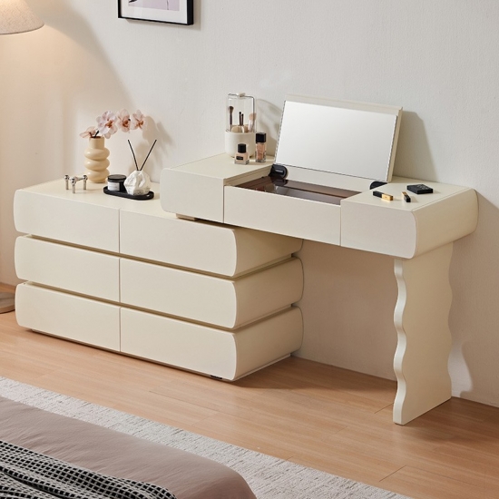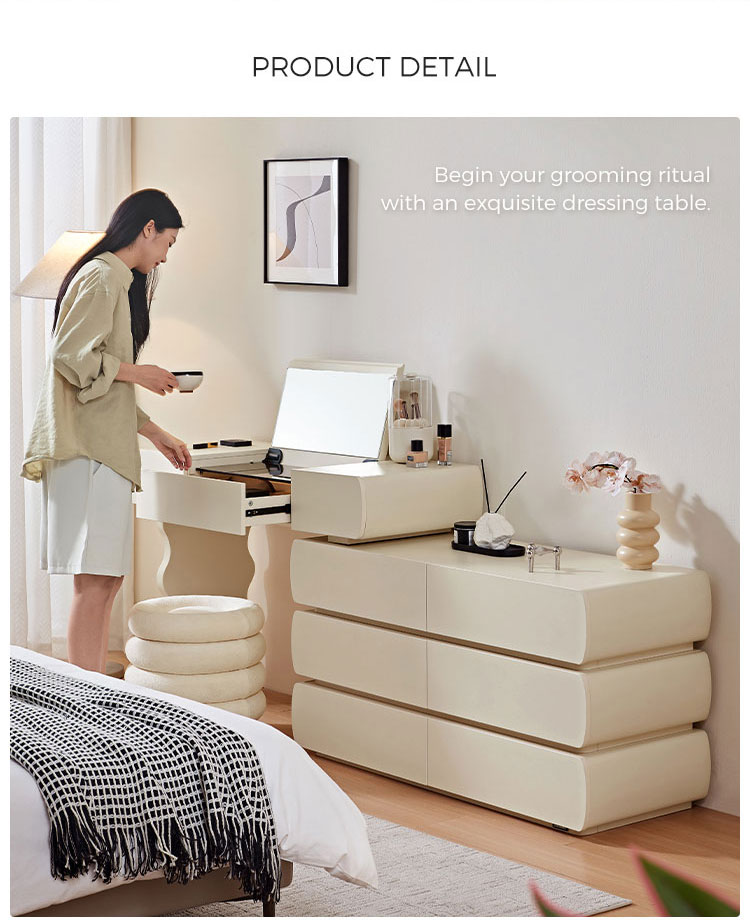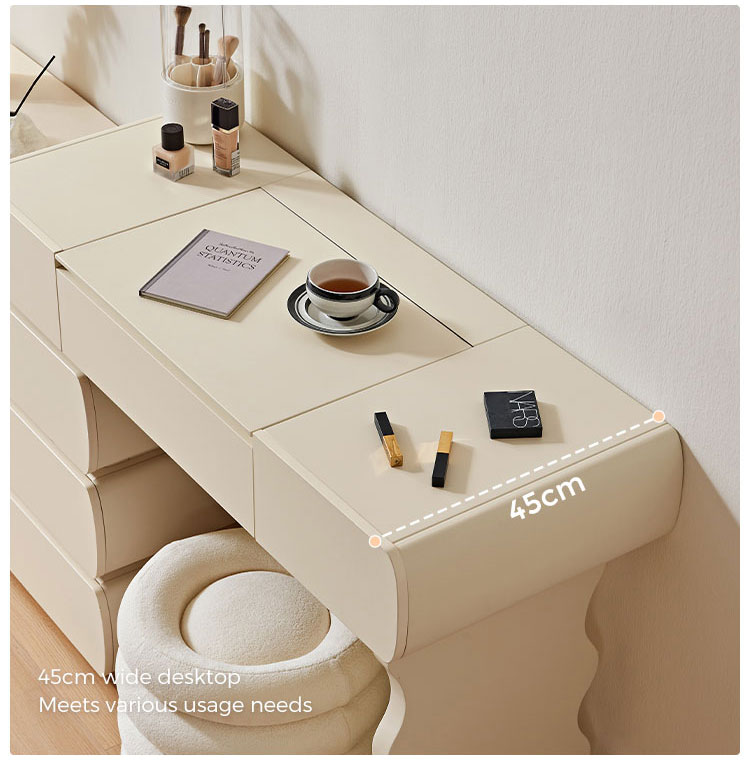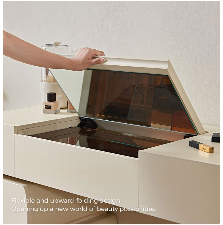 Espejo elegante integrado: La pieza central es un espejo con un bonito marco, ingeniosamente integrado sobre la cómoda. Su generoso tamaño proporciona un reflejo nítido para arreglarse y maquillarse, a la vez que aporta profundidad y luminosidad al espacio.
