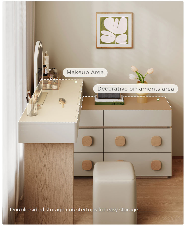 Superficie exclusiva para tocador: Su amplia superficie ofrece la plataforma perfecta para tu ritual de belleza. Exhibe perfumes, productos para el cuidado de la piel o joyeros con elegancia.