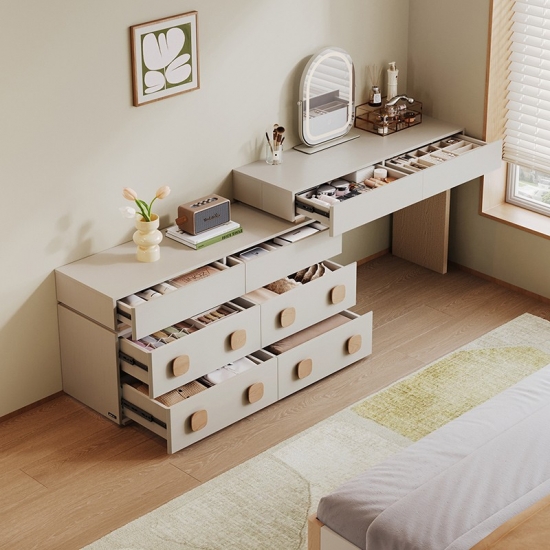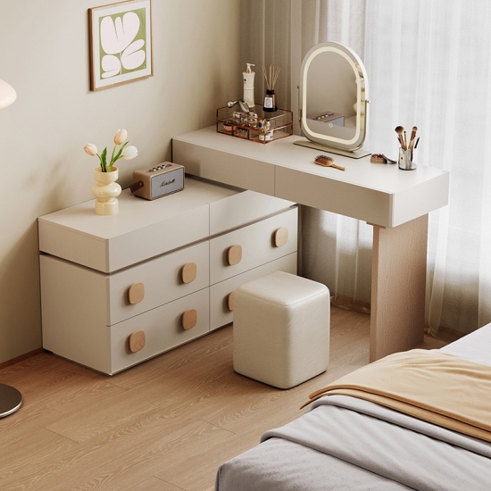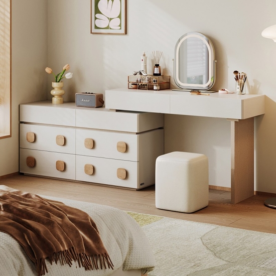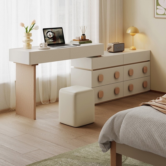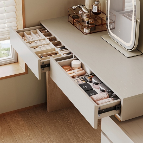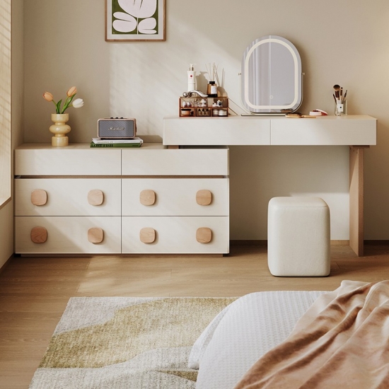 Elegante espejo integrado: La pieza central es un espejo con un hermoso marco, cuidadosamente integrado sobre la cómoda. Su generoso tamaño ofrece un reflejo nítido para asearse y maquillarse, a la vez que aporta profundidad y luminosidad a su espacio.