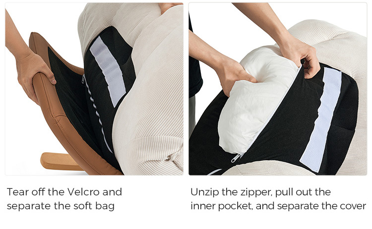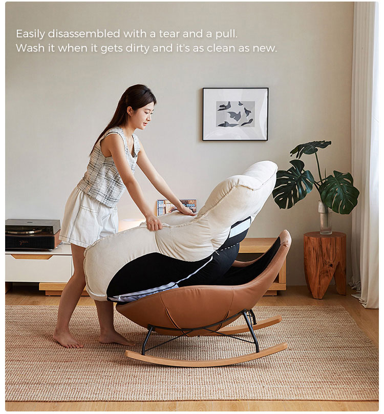 1. Cojín extraíble: El grueso y cómodo cojín del asiento es totalmente extraíble. Úselo para disfrutar de una comodidad suave y acolchada en la base de la mecedora, o retírelo para usarlo como un versátil puf o otomana de suelo, ofreciendo dos muebles en uno.